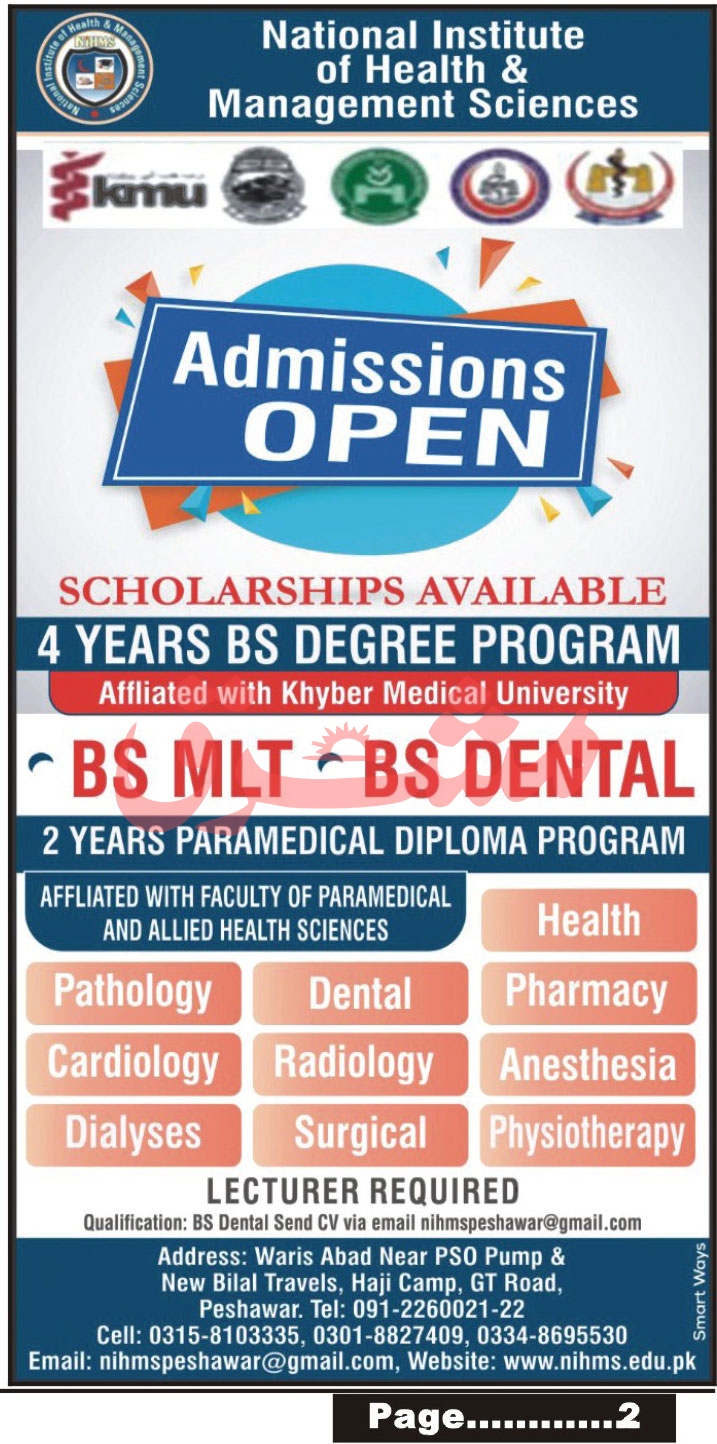 National Institute of Health & Management Sciences invited applications for admissions in BS MLT, BS Dental and Paramedical Diploma Program in Peshawar Khyber Pakhtunkhwa KPK. Read newspaper ad for exact details.