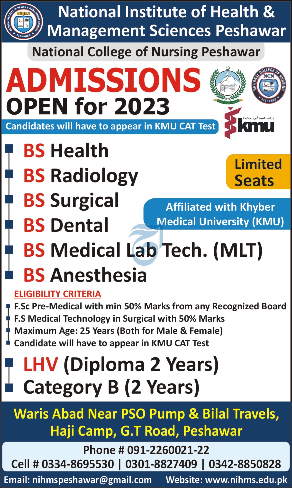 Admissions in National Institute of Health & Management Sciences 2023 for BS Degree in Health, Radiology, Surgical, Dental, Medical Lab Technology MLT, Anesthesia, LHV Diploma, B Pharmacy has been announced. Students can enroll for admissions in National Institute of Health & Management Sciences Peshawar Khyber Pakhtunkhwa KPK Pakistan for academic year 2023 to continue campus based or online education in Medical Medical College. Students for admissions in BS and B Pharmacy can apply for online or campus classes as per Private institute criteria till admission closing date December 18, 2023. Read newspaper ad for exact details.