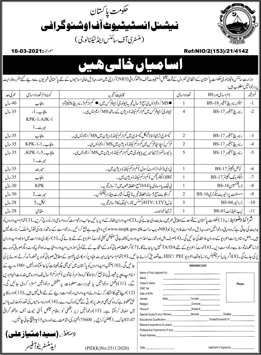 National Institute of Oceanography Government of Pakistan Ministry of Science & Technology intends to hire qualified and experienced individuals for the posts of Senior Research Officer, Research Officer, Coastal Engineer, Electronic Engineer, Draftsman, Assistant Private Secretary, LTV Driver, HTV Driver and Lab Attendant in Karachi Sindh Pakistan 2021.