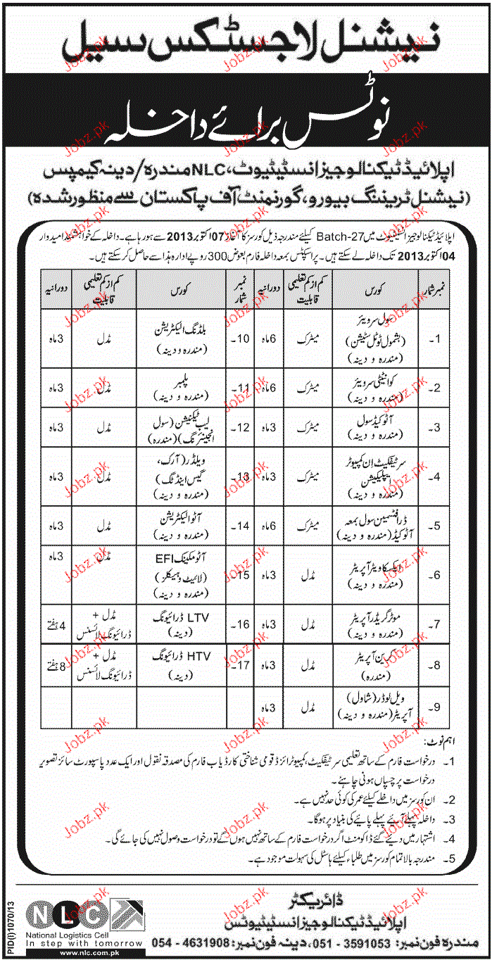 National Logistics Cell Admission in Construction Technology in Deena in Jhelum Read newspaper ad for exact details.