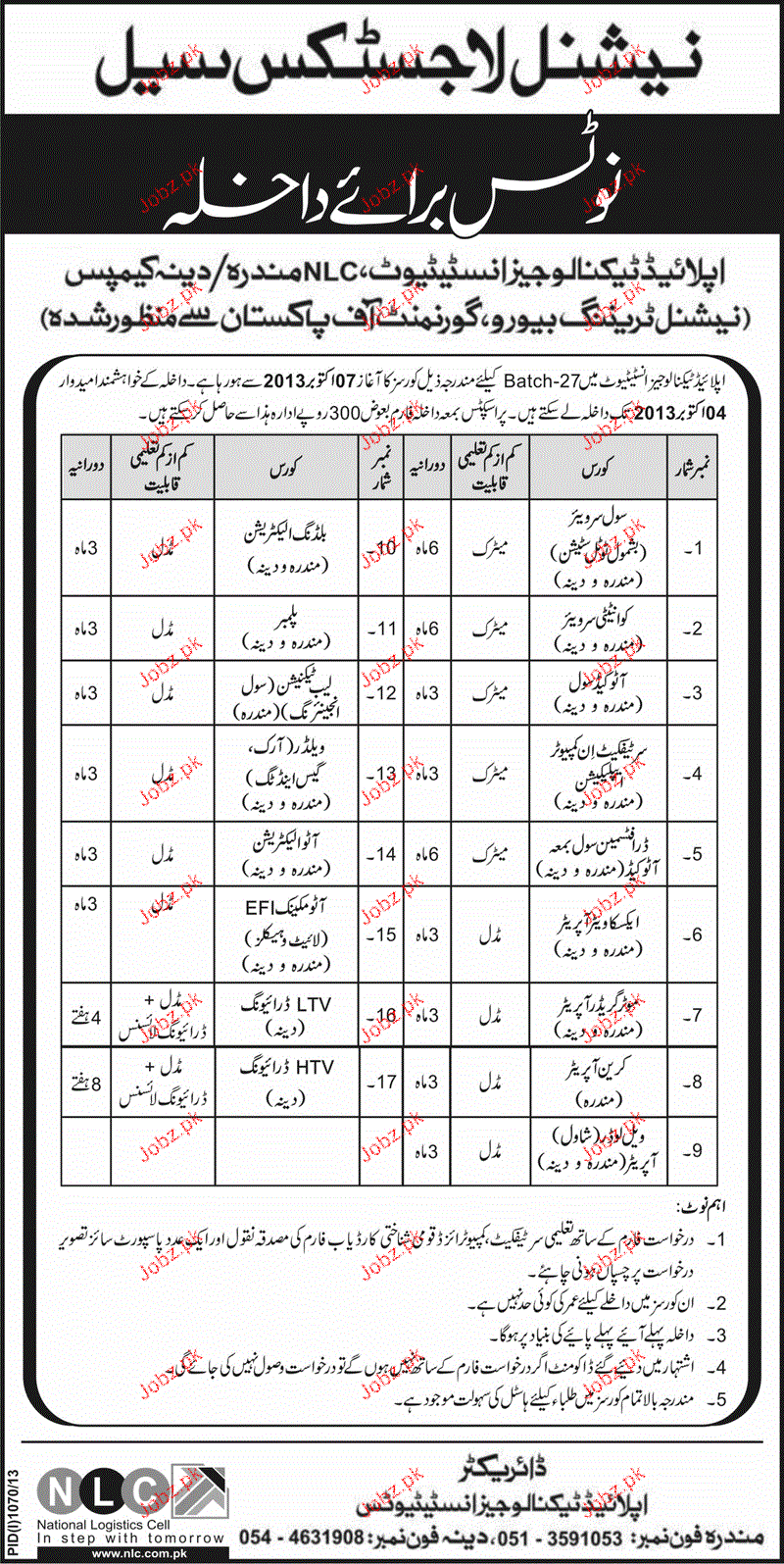 National Logistics Cell Admission in Construction Technology Courses in Jhelum Read newspaper ad for exact details.