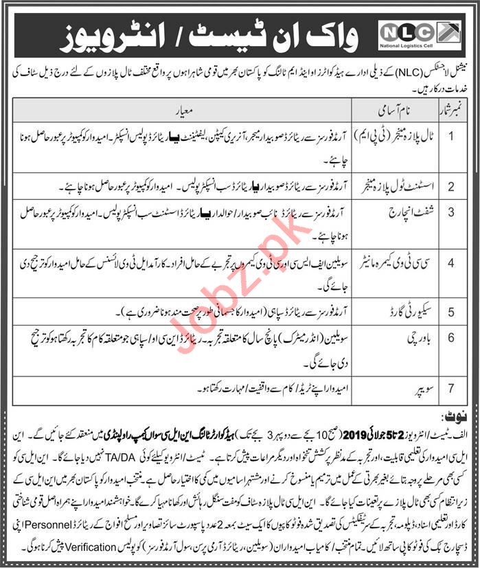 National Logistics Cell NLC is looking for hardworking and experienced candidates for the posts of Toll Plaza Manager, Assistant Toll Plaza Manager, Shift Incharge, CCTV Camera Monitor, Security Guard, Cook, Sweeper in Rawalpindi. Candidates retired from army will be given preference.