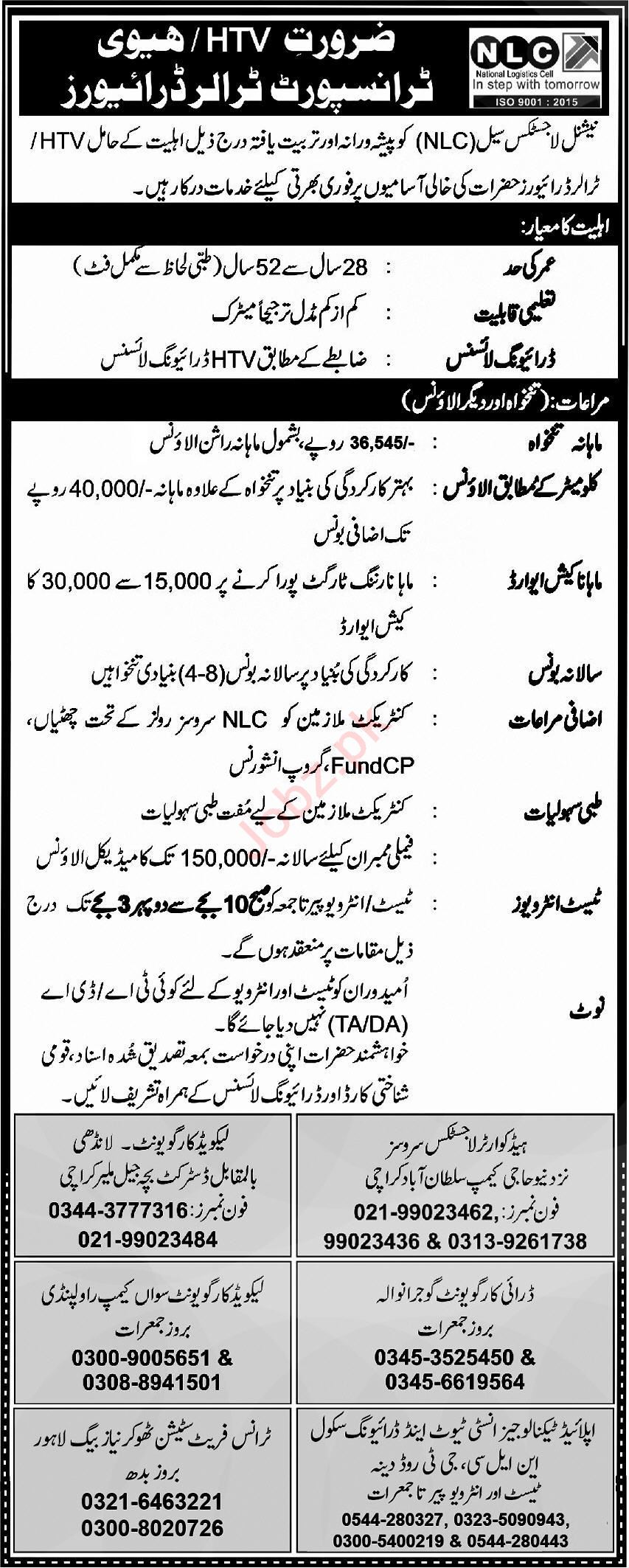 Vacant posts including driver, trailer driver and htv driver are announced in National Logistics Cell NLC Karachi, rawalpindi and lahore Sindh Pakistan as per 23 October 2022 advertisement in daily Express Newspaper. Persons with Matric etc. education can apply.
