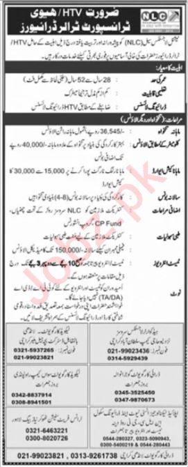 Vacant posts including htv driver and driver are announced in National Logistics Cell NLC Karachi, gujranwala, rawalpindi, peshawar and lahore Sindh Pakistan as per 4 June 2023 advertisement in daily Jang Newspaper. Matric etc. educational qualification will be preferred.
