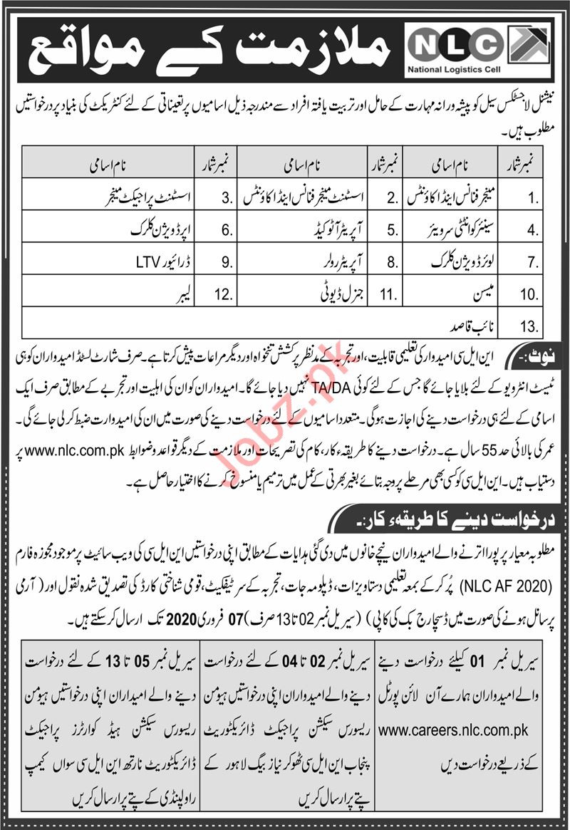 National Logistics Cell NLC is subordinate of Pakistan Army invites applications from highly educated expert and experienced professionals for the post of Manager Finance, Accounts Manager, Quantity Surveyor, LDC, Lower Division Clerk, Mason, Assistant manager Accounts, Assistant Manager Finance, Auto Cad Operator, Roller Operator, General Duty, Assistant Project Manager, UDC, Upper Division Clerk, LTV Driver, Labor in Rawalpindi and Lahore.