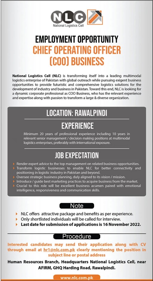 National Logistics Cell NLC jobs advertisement dated about 2 November 2022 in daily The News Newspaper invites application for the vacant post of chief operating officer coo in Rawalpindi, rawalpindi Punjab Pakistan. Preferred Education is Master, MS and Bachelor etc.
