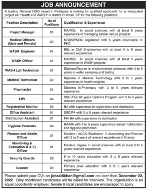 National NGO Dera Ismail Khan, dera ismail khan Khyber Pakhtunkhwa KPK Pakistan invites applications from eligible candidates for the post of finance admin officer, lhv, cleaner, pharmacist, medical officer, wash lab technician, security guard, distribution assistant, wash engineer, monitoring evaluation officer, project manager, wash officer, medical technician, hygiene promotor, office assistant and registration monitor as per advertisement of December 16, 2022 published in daily Mashriq Newspaper. Primary, Intermediate, Middle, Master and Bachelor etc. educational qualification will be preferred.