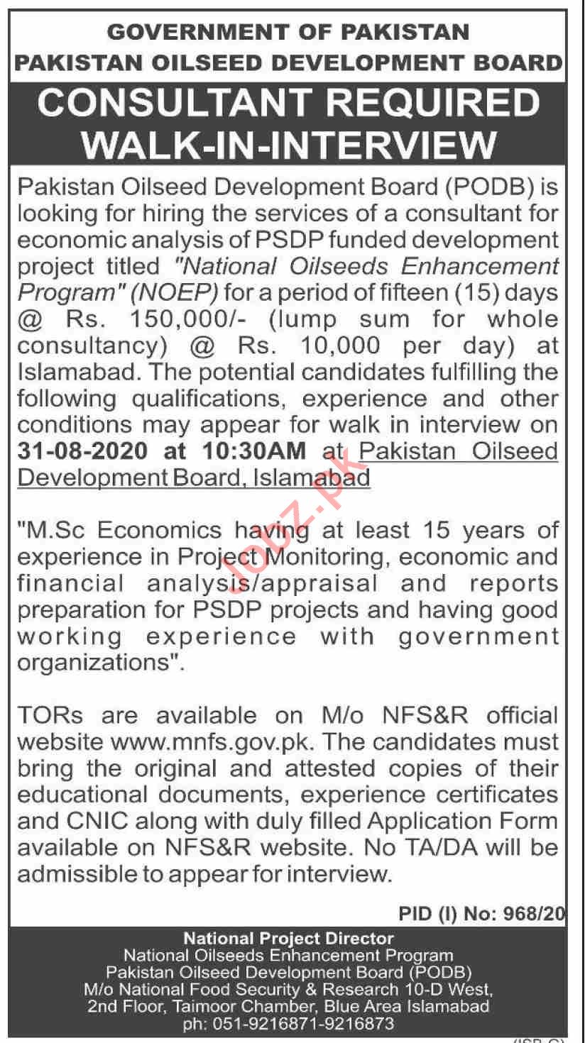 Latest Ministry of National Food Security & Research MNFSR Consultant Posts Islamabad 2025