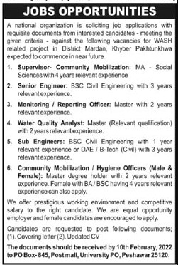 National Organization Mardan Khyber Pakhtunkhwa KPK Pakistan invites applications from eligible candidates for the post of Civil Engineer, hygiene officer, Hygiene Office, reporting officer, monitoring officer, Community mobilization, sub engineer, supervisor community mobilization and water quality analyst as per advertisement of January 31, 2022 published in daily Mashriq Newspaper. Preferred Education is Others, DAE, BA and Intermediate etc.