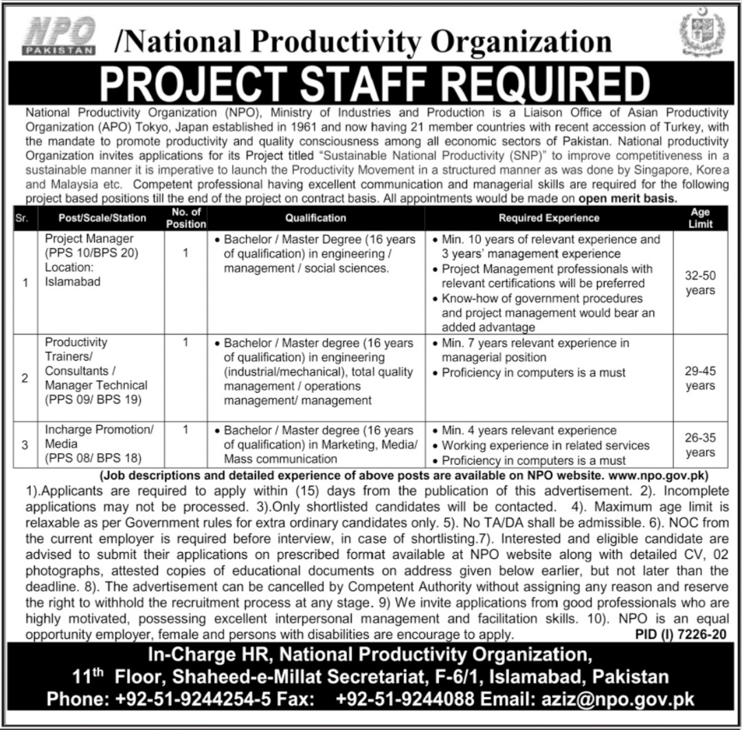 Vacancies in National Productivity Organization NPO Advertisement July 2021
