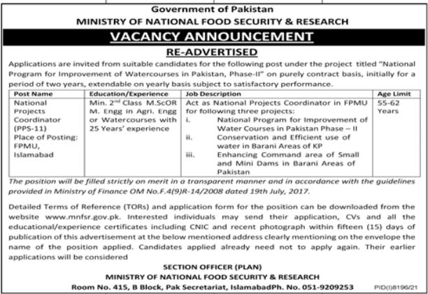 Ministry of National Food Security & Research MNFSR jobs advertisement dated about 23 May 2022 in daily Jang Newspaper invites application for the vacant post of national projects coordinator in Islamabad, islamabad Islamabad Pakistan. Preferred Education is Master, M.sc and Others etc.