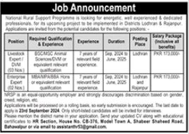 National Rural Support Programme NRSP is looking for candidates for following posts as per job advertisement published in daily Jang Newspaper of September 20, 2024 for location Bahawalpur, bahawalpur Punjab Pakistan: