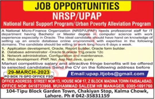Vacant posts including web development php, application development report builder, dot net developer, database administrator, asp dot net developer, application development oracle form builder, network administrator, application development oracle and java developer are announced in National Rural Support Programme NRSP Faisalabad, faisalabad Punjab Pakistan as per 12 March 2023 advertisement in daily Dunya Newspaper. Educational qualifications required Master and Bachelor etc.