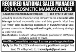 Private Company Islamabad, rawalpindi and islamabad Islamabad Pakistan invites applications from eligible candidates for the post of national sales manager as per advertisement of November 16, 2025 published in daily Jang Newspaper. MBA etc. educational qualification will be preferred.