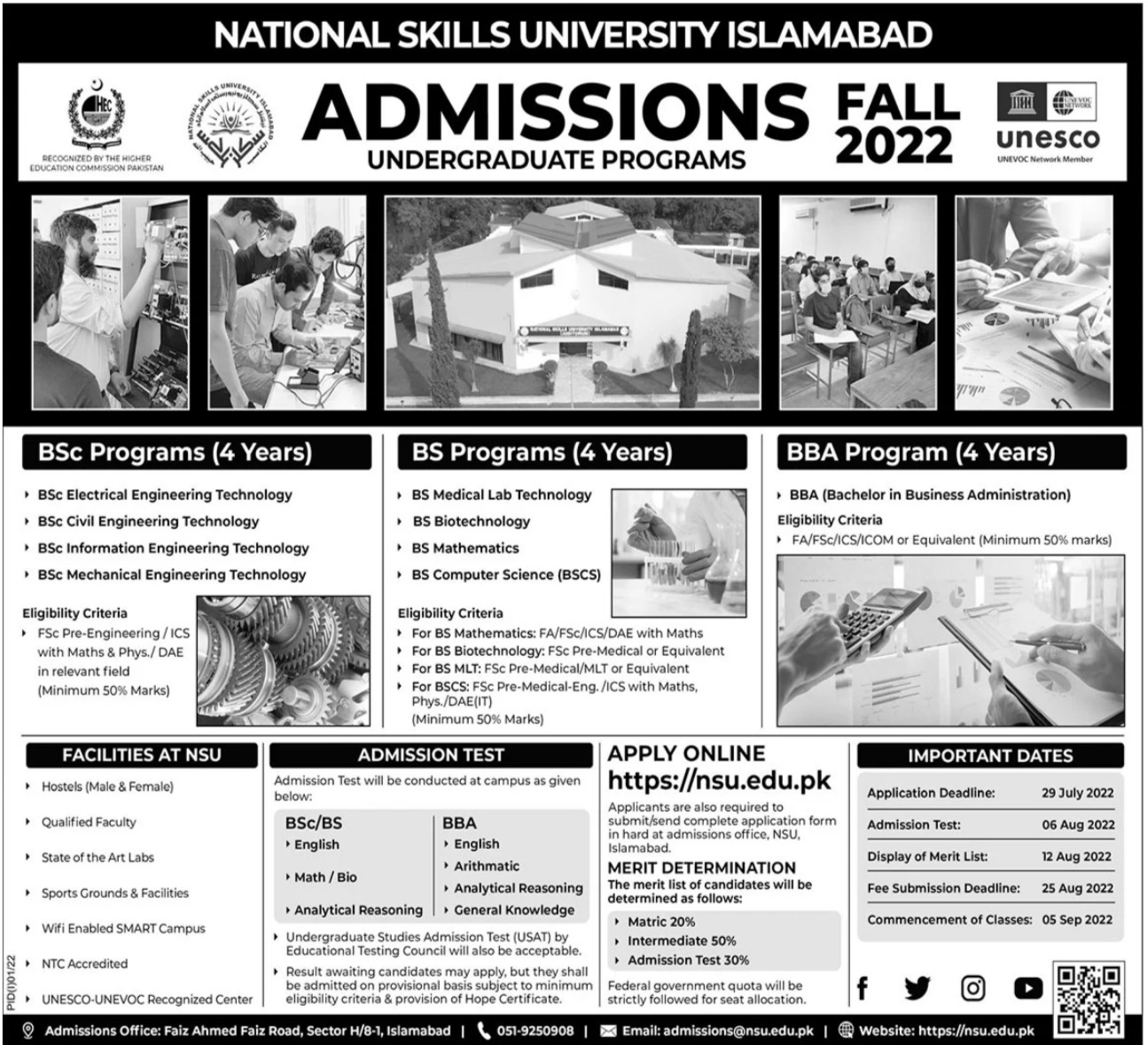 National Skills University BS in in Medical Lab Technology, Biotechnology, Mathematics, Computer Science, Bsc in in Electrical Engineering, Civil Engineering Technology, Information Engineering Technology, Mechanical Engineering Technology, BBA, Bachelor of Business Administration admissions 2022 has been announced. Students can enroll for admissions in National Skills University Islamabad Islamabad Pakistan for academic year 2022 to continue campus based or online education in Science University. Eligible students for fulfilling criteria for admissions in BS, BSc Hons and BBA can enroll as per Government admission policy 2022 till closing date 29 July 2022. Read newspaper ad for exact details.