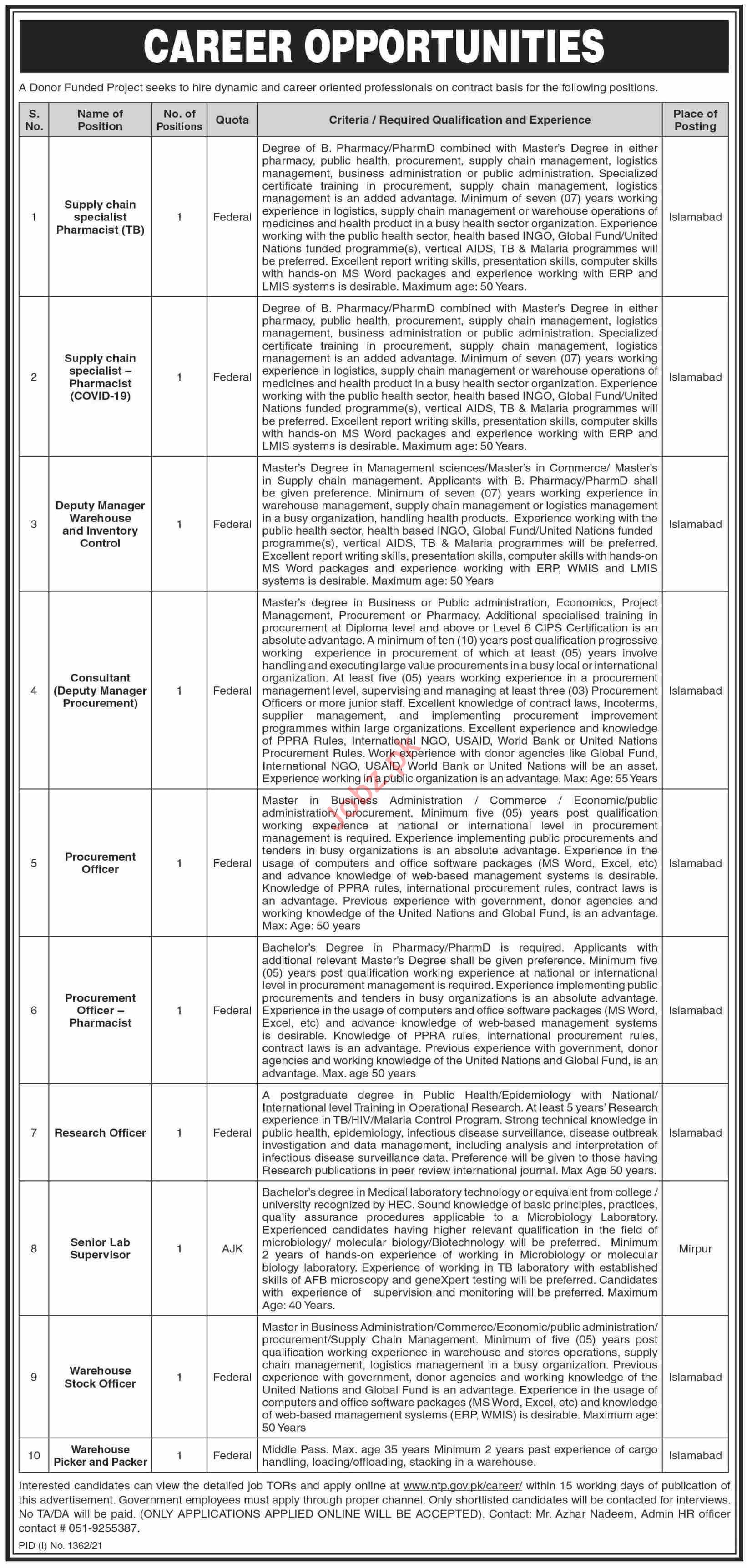 National TB Control Program NTP is hiring experienced and qualified candidates for the posts of Supply Chain Specialist Pharmacist TB, Supply Chain Specialist Pharmacist, Deputy Manager in Warehouse and Inventory Control, Consultant Deputy Manager Procurement, Procurement Officer, Procurement Officer Pharmacist, Research Officer, Senior Lab Supervisor, Warehouse Stock Officer, Warehouse Picker and Packer in Islamabad and AJK.
