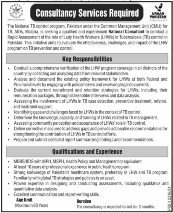 National TB Control Program NTP jobs advertisement dated about 7 February 2025 in daily Khabrain Newspaper invites application for the vacant post of national consultant in Islamabad, islamabad Islamabad Pakistan. Candidates with Bachelor and Master etc. educational background will be preferred.