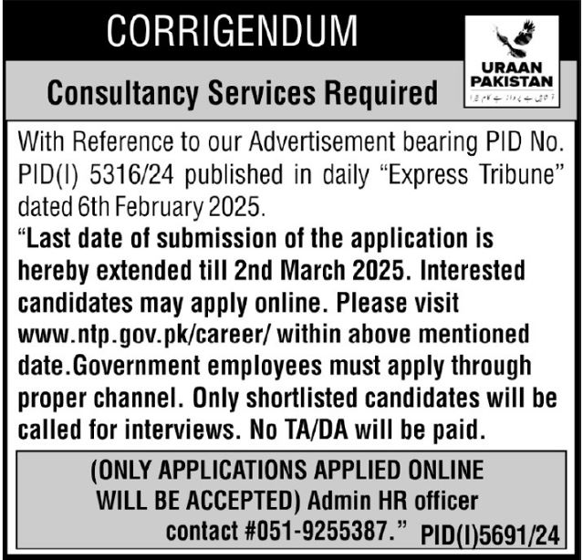 Apply as per details in job advertisement. Login to view further details of how to apply via https://www.jobz.pk online.