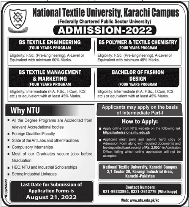 National Textile University BS in Textile Engineering, Textile Management & Marketing, Polymer & Textile Chemistry, Bachelor of Fashion Design BFA admissions 2022 has been started. Eligible students can apply for academic admissions 2022 in National Textile University Karachi Sindh Pakistan for Fashion University. Students for admissions in BFA and BS can apply for online or campus classes as per Government institute criteria till admission closing date August 21, 2022. Read newspaper ad for exact details.