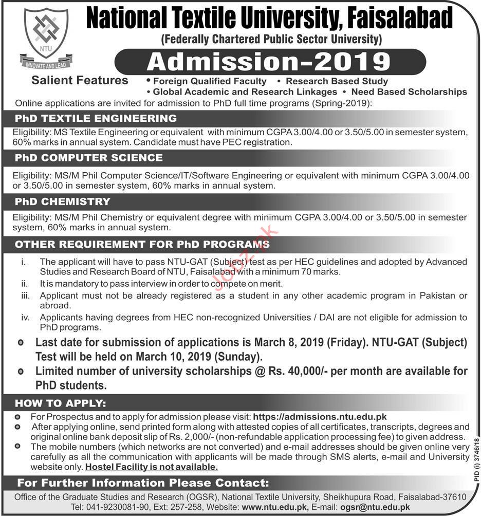 National Textile University NTU Faisalabad, Pakistan are started admissions spring 2019 for the classes of PhD in Textile Engineering, Computer Science & Chemistry etc. Read newspaper ad for exact details.