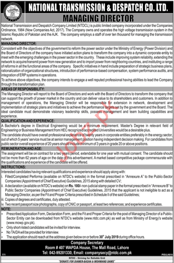 Vacancies in National Transmission and Despatch Company NTDC Advertisement July 2019