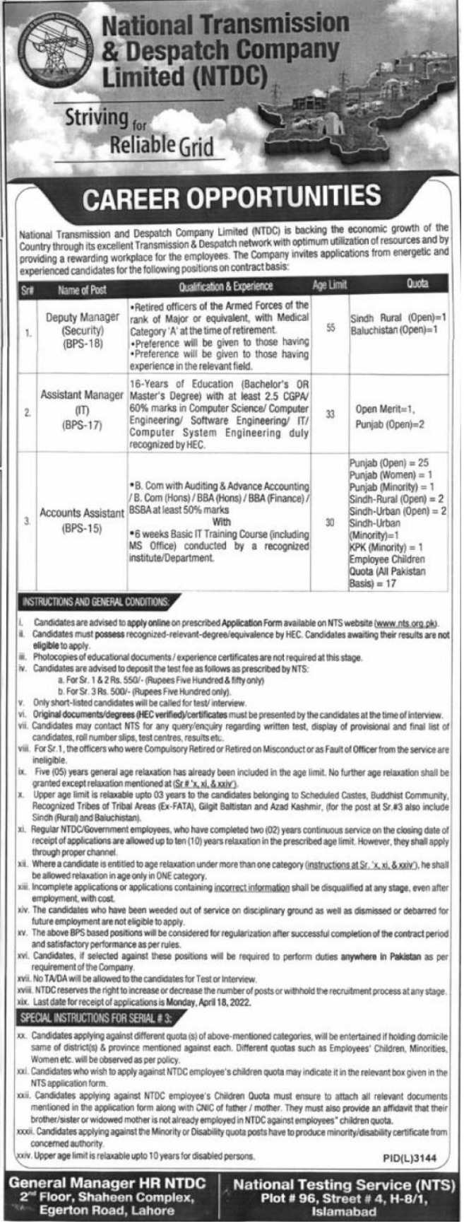 Vacant posts including accounts assistant, assistant manager it and deputy manager security are announced in National Transmission and Despatch Company NTDC Lahore, lahore Punjab Pakistan as per 3 April 2022 advertisement in daily Daily Pakistan Newspaper. Candidates with Master and Bachelor etc. educational background will be preferred.