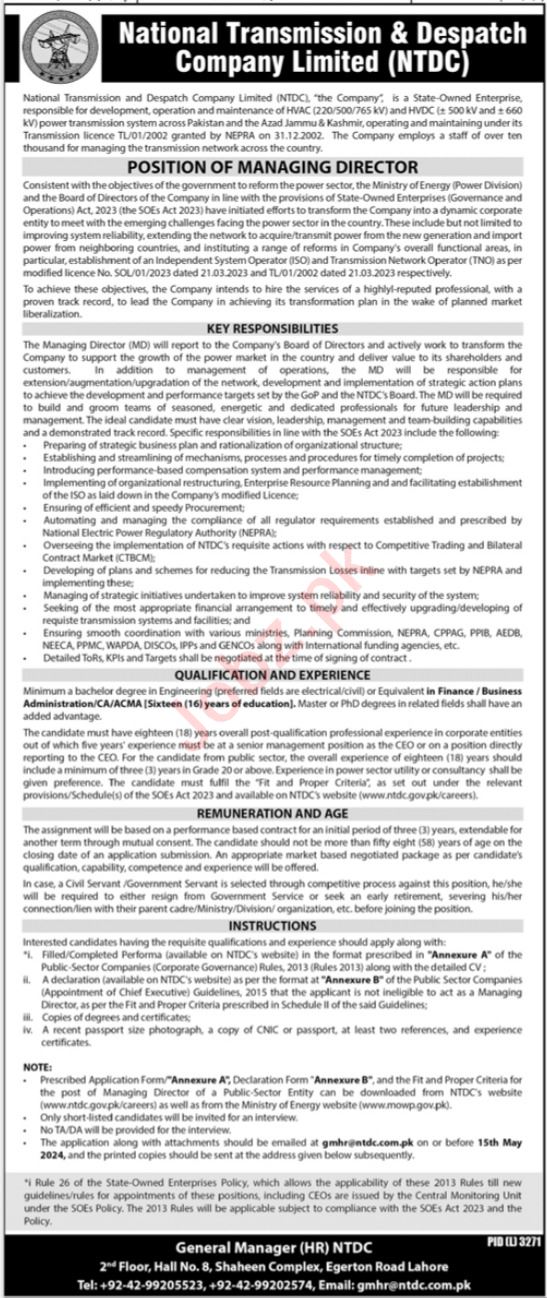 National Transmission and Despatch Company NTDC Lahore, lahore Punjab Pakistan invites applications from eligible candidates for the post of managing director as per advertisement of April 21, 2024 published in daily Jang Newspaper. Persons with Master, ACCA, MBA, Bachelor, BBA and CA etc. education can apply.