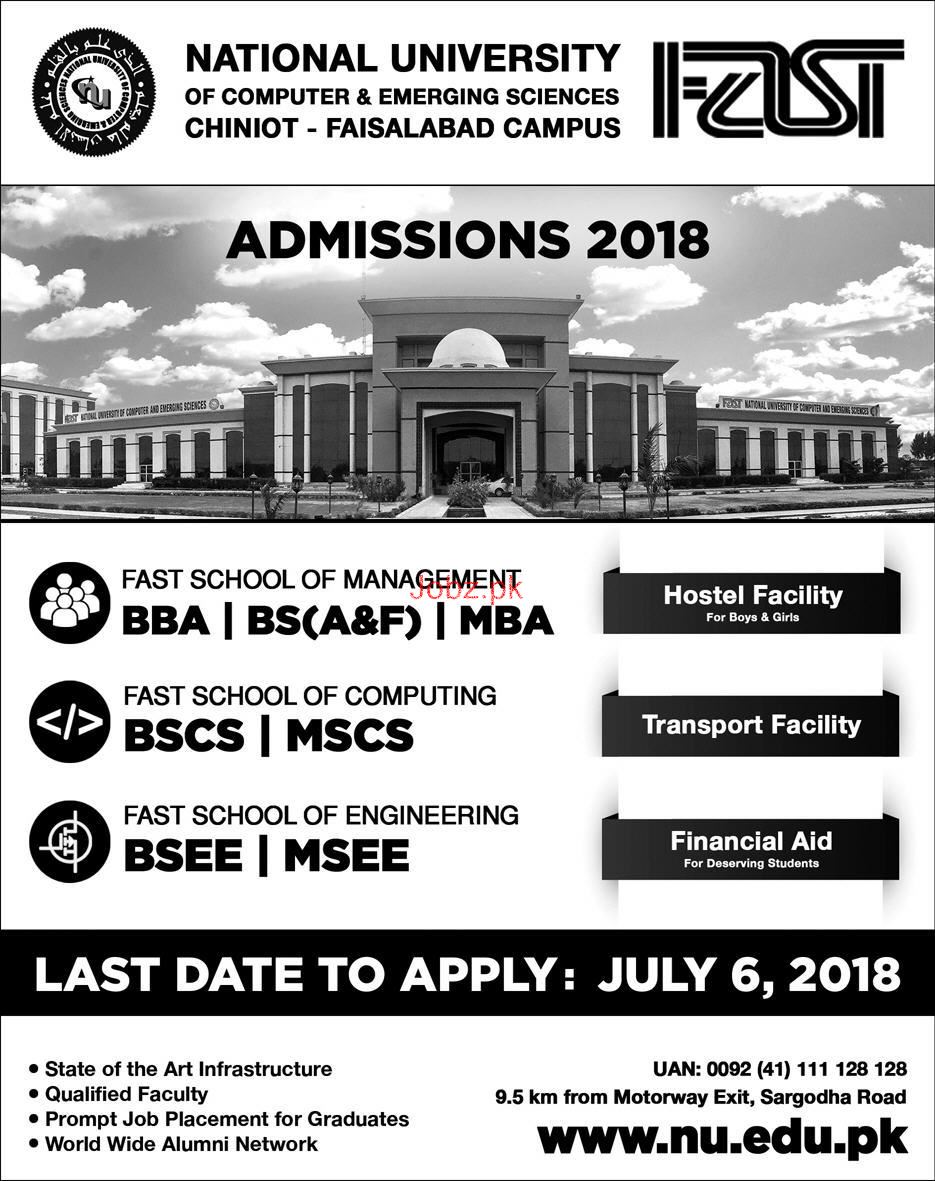 National University of Computer & Emerging Sciences Admission in BBA / BS A & F / MBA, BSCS / MSCS, in Faisalabad Campus. Last date for submission of admission forms is 06 July 2018. Read newspaper ad for exact details.