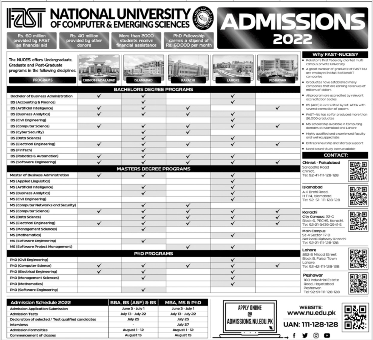 Admissions in National University of Computer & Emerging Sciences 2022 for BS in Accounting and Finance, Artificial Intelligence, Business Analytics, Civil Engineering, Computer Science, Cyber Security, Data Science, Electrical Engineering, FinTech, Robotics and Automation, Software Engineering, MS in Applied Linguistics, Artificial Intelligence, Business Analytics, Civil Engineering, Computer Networks and Security, Computer Science, Data Science, Electrical Engineering, Management Sciences, Mathematics, Software Engineering, Software Project Management, PhD in Civil Engineering, Computer Science Electrical Engineering, Management Sciences, Mathematics, Software Engi has been announced. Eligible students can apply for academic admissions 2022 in National University of Computer & Emerging Sciences Islamabad Islamabad Pakistan for Science University. Eligible students for fulfilling criteria for admissions in MBA, MS, Phd, BS and BBA can enroll as per Private admission policy 2022 till closing date 20 June 2022. Read newspaper ad for exact details.