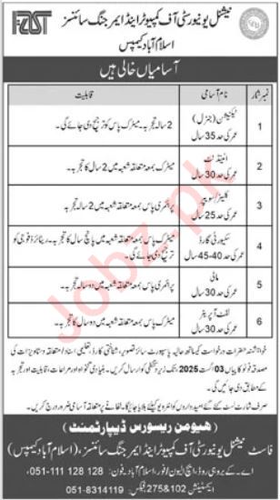 National University of Computer & Emerging Sciences Islamabad, islamabad Islamabad Pakistan invites applications from eligible candidates for the post of security guard, mali, attendant, lift operator, sweeper, cleaner and technician general as per advertisement of July 28, 2025 published in daily Jang Newspaper. Candidates with Middle, Matric and Primary etc. educational background will be preferred.