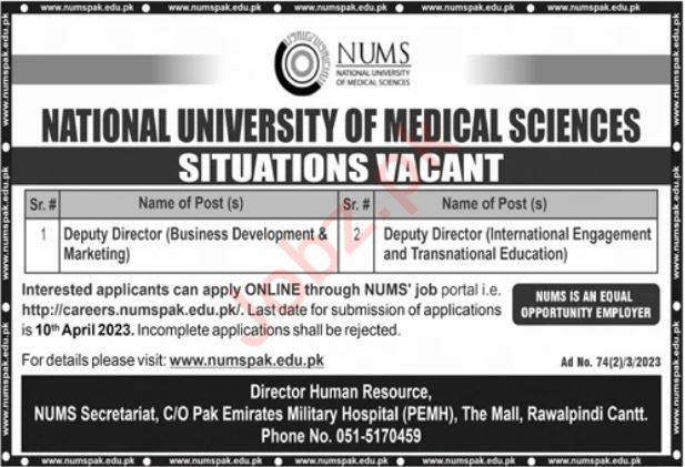 Vacant posts including deputy director marketing, deputy director business development and deputy director international engagement translation education are announced in National University of Medical Sciences NUMS Rawalpindi, rawalakot Punjab Pakistan as per 26 March 2023 advertisement in daily Jang Newspaper. Candidates with Bachelor and Master etc. educational background will be preferred.