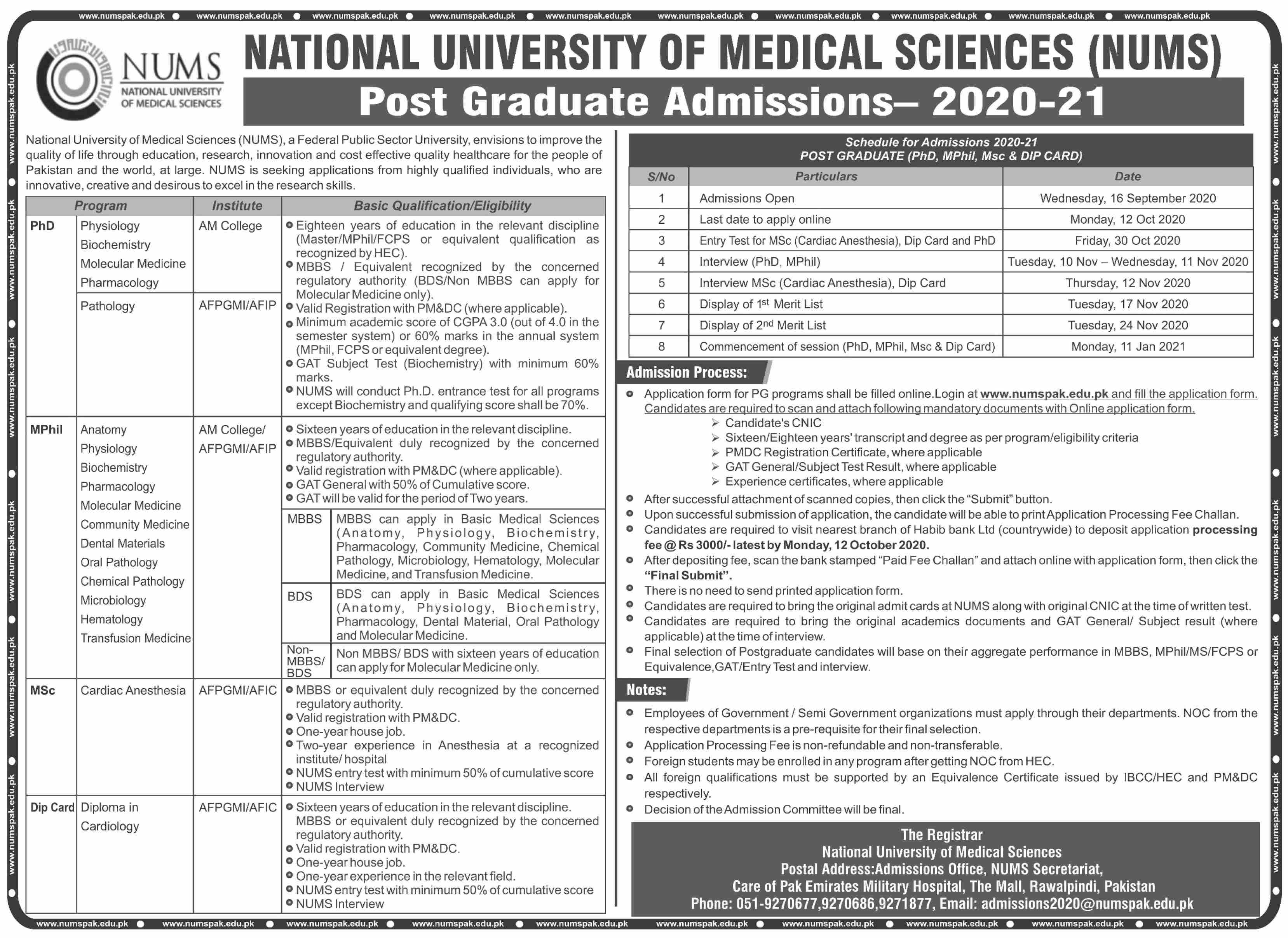National University of Medical Sciences NUMS a Federal Public Sector University invited applications for admissions in PhD, M.Phil, MSc and Diploma in Rawalpindi. Read newspaper ad for exact details.
