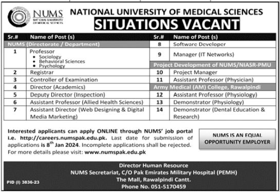 Latest Government jobs in National University of Medical Sciences NUMS in Education and others can be applied till 8 January 2024 or as per closing date in newspaper ad. Read complete ad online to know how to apply on latest National University of Medical Sciences NUMS job opportunities.