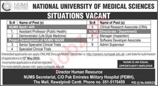 National University of Medical Sciences NUMS latest Government Education jobs and others can be applied till 13 June 2024 or as per closing date in newspaper ad. Read complete ad online to know how to apply on latest National University of Medical Sciences NUMS job opportunities.