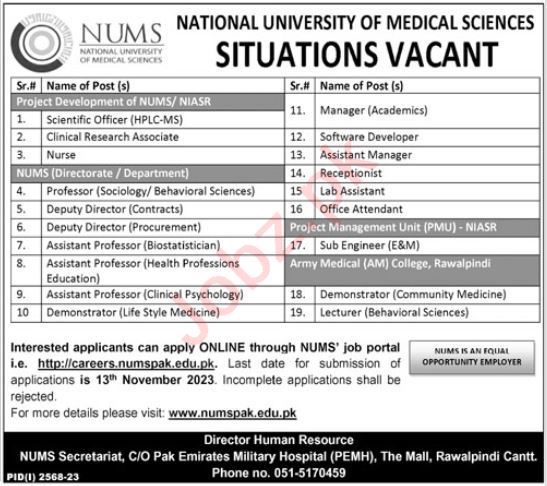 National University of Medical Sciences NUMS is looking for candidates for following posts as per job advertisement published in daily Jang Newspaper of October 29, 2023 for location Rawalpindi, rawalpindi Punjab Pakistan: