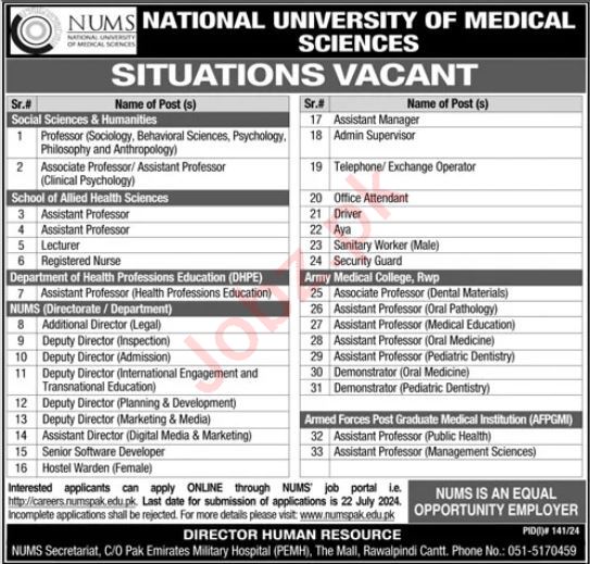Vacant posts including Lecturer, Driver, Assistant Manager, Professor, Demonstrator, Deputy Director Marketing Media, Assistant Director Digital Media Marketing, Aya, Exchange Operator, Male Sanitary Worker, Deputy Director Inspection, Associate Professor, Deputy Director Planning Development, Female Hostel Warden, Telephone Operator, Security Guard, Software Developer, Office Attendant, Deputy Director International Engagement Transnational Education, Registered Nurse, Admin Supervisor, Deputy Director Admission, Assistant Professor and Additional Director Legal are announced in National University of Medical Sciences NUMS Rawalpindi, rawalpindi Punjab Pakistan as per 7 July 2024 advertisement in daily Jang Newspaper. Persons with Intermediate, Mphil, Matric, Bachelor, Master and Phd etc. education can apply.