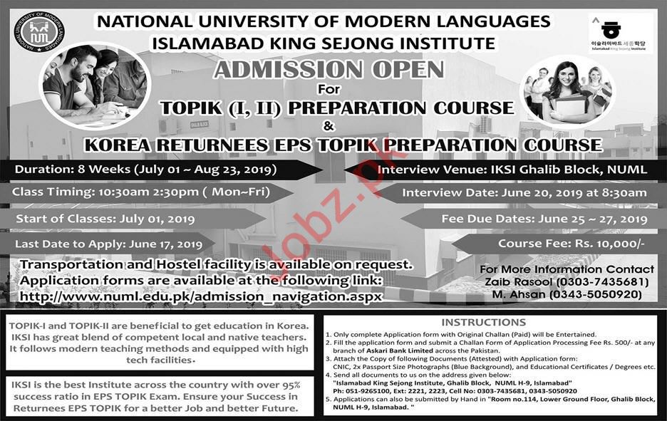 National University of Modern Languages NUML Islamabad King Sejong Institute offering admissions for Topik I-II Preparation Course & Korea Returnees EPS Topik Preparation Course. Read newspaper ad for exact details.