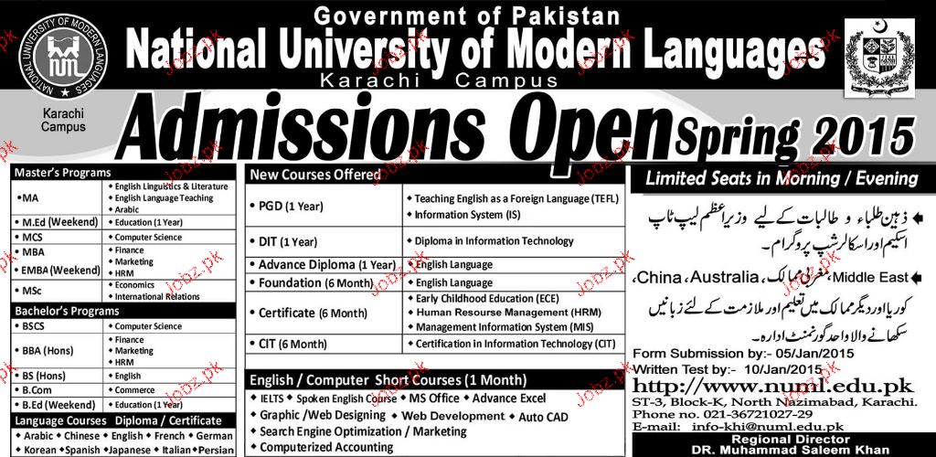National University of Modern Languages Admission in MA, MBA, MCS, BS and PGD in Islamabad. Read newspaper ad for exact details.