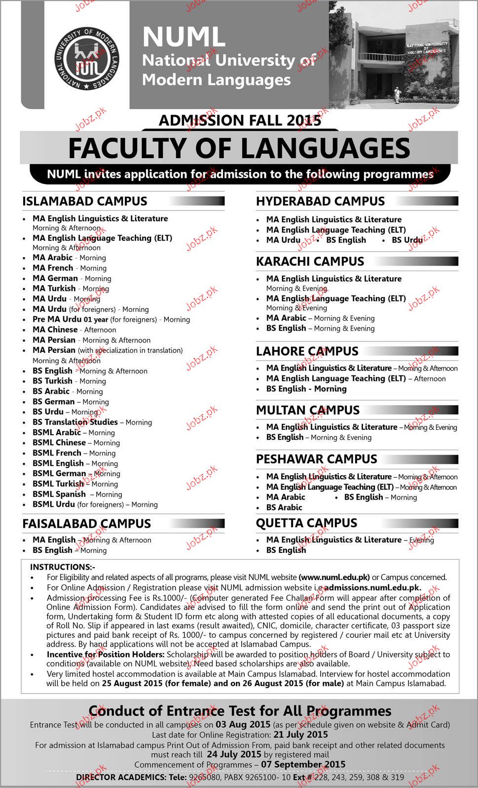 National University of Modern Languages Admission in MA and BS in Hyderabad. Read newspaper ad for exact details.