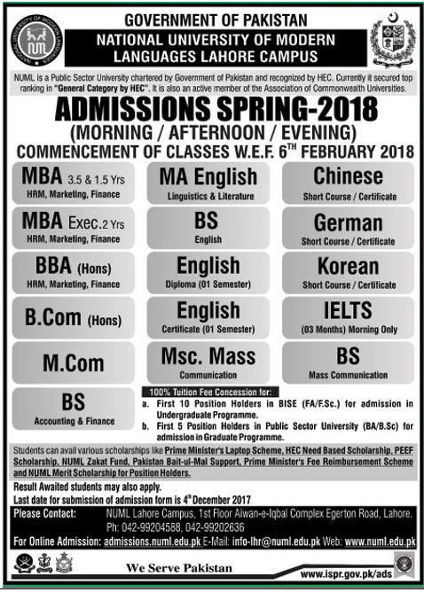 National University of Modern Languages Lahore Campus NUML, Pakistan open admission spring 2018 for the classes of MBA, BBA, B Com, M Com, BS, MA English, M Sc Mass Communication, Chinese, German, Korean, IELTS and BS Mass Communication. Read newspaper ad for exact details.