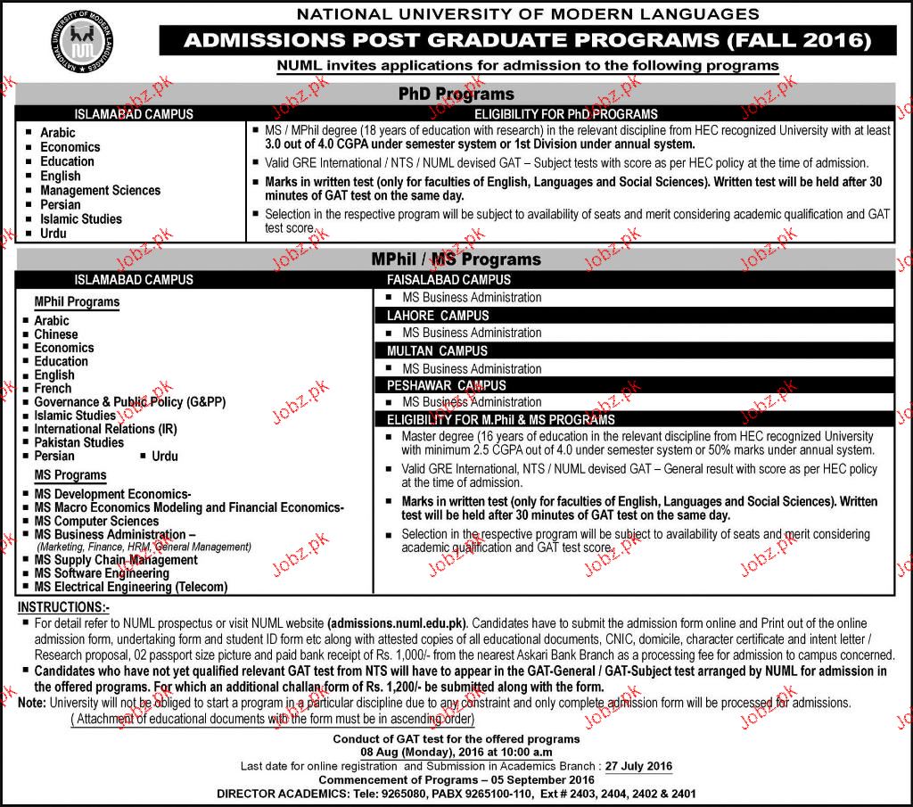 National University of Modern Languages Admission in Mphill and Phd in karachi. Read newspaper ad for exact details.