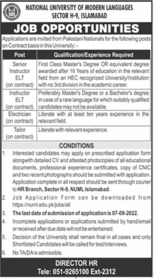 Vacancies in National University of Modern Languages NUML Advertisement August 2022