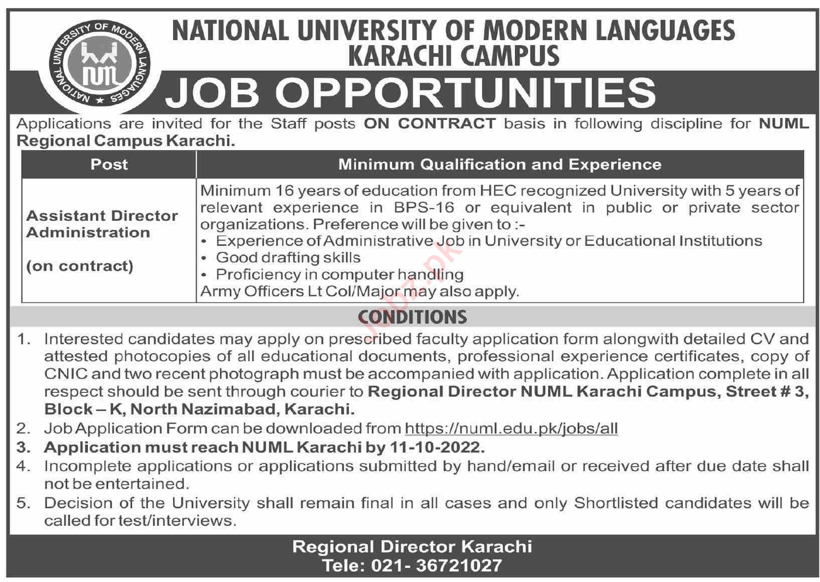 National University of Modern Languages NUML Karachi, karachi Sindh Pakistan invites applications from eligible candidates for the post of assistant director administration as per advertisement of September 26, 2022 published in daily Dawn Newspaper. Educational qualifications required Bachelor, MS, Primary and Master etc.