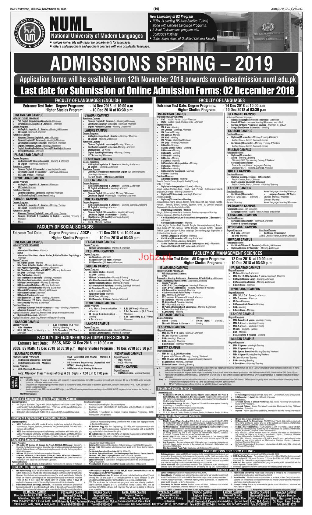 National University of Modern Languages NUML Admission in Diploma in English Language, MA English Language, BS English, BS Mass Communication and MSc in Islamabad. Read newspaper ad for exact details.