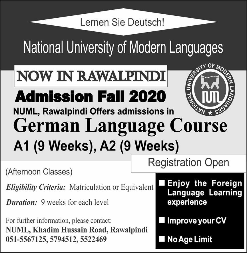 National University of Modern Languages NUML is a public university with its main campus located in Islamabad invited application for admission in German Language Course. Read newspaper ad for exact details.