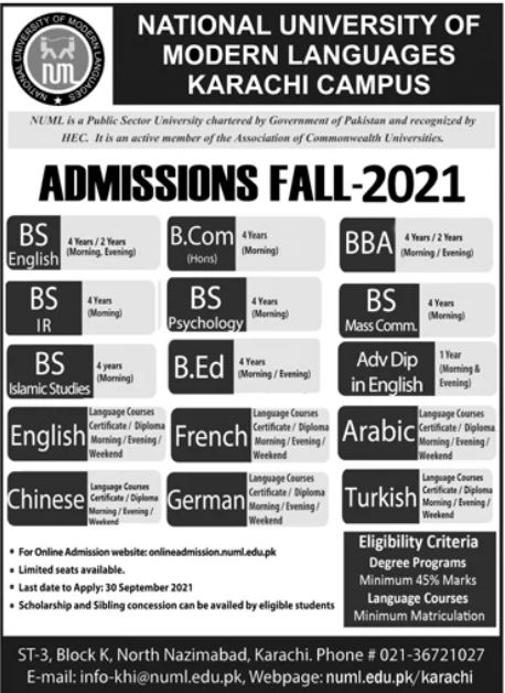 National University of Modern Languages NUML Karachi Campus invites applications for admissions in BS, B-Com, B.Ed, BBA, Diploma and Courses programs 2021. Read newspaper ad for exact details.