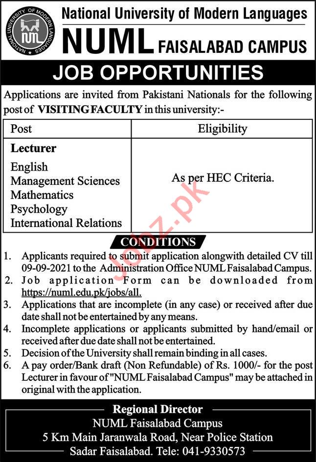 Latest National University of Modern Languages NUML Teaching Posts Faisalabad 2025
