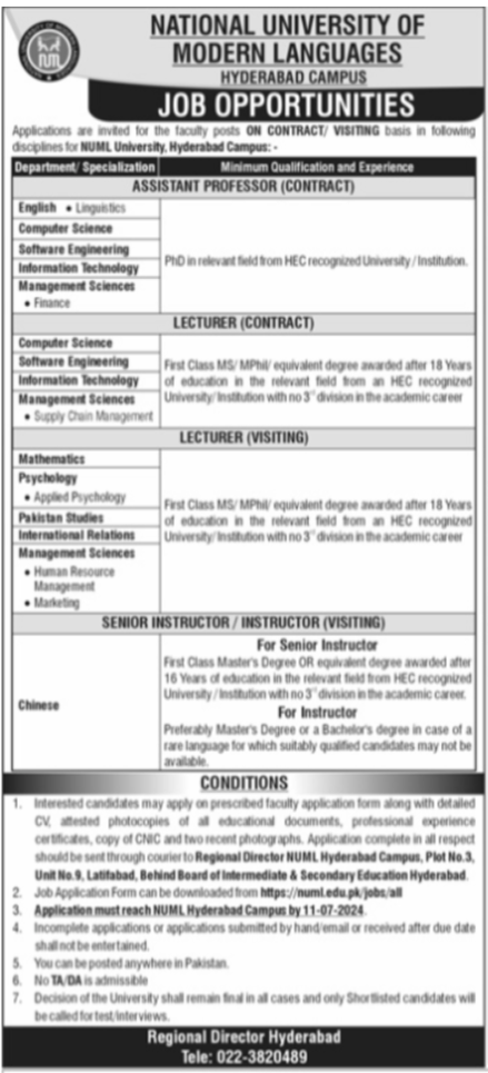 Latest National University of Modern Languages NUML Education Posts Hyderabad 2025