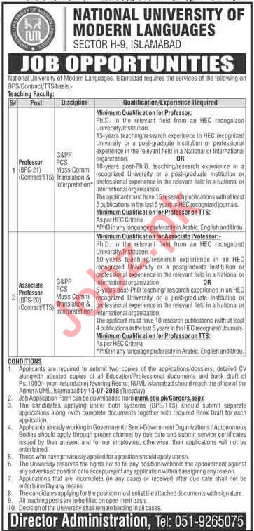 Latest National University of Modern Languages NUML Teaching Posts Islamabad 2025