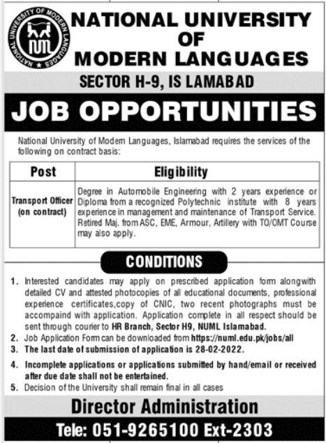 Vacant posts including transport officer are announced in National University of Modern Languages NUML Islamabad Pakistan as per 13 February 2022 advertisement in daily Jang Newspaper. Master and Bachelor etc. educational qualification will be preferred.